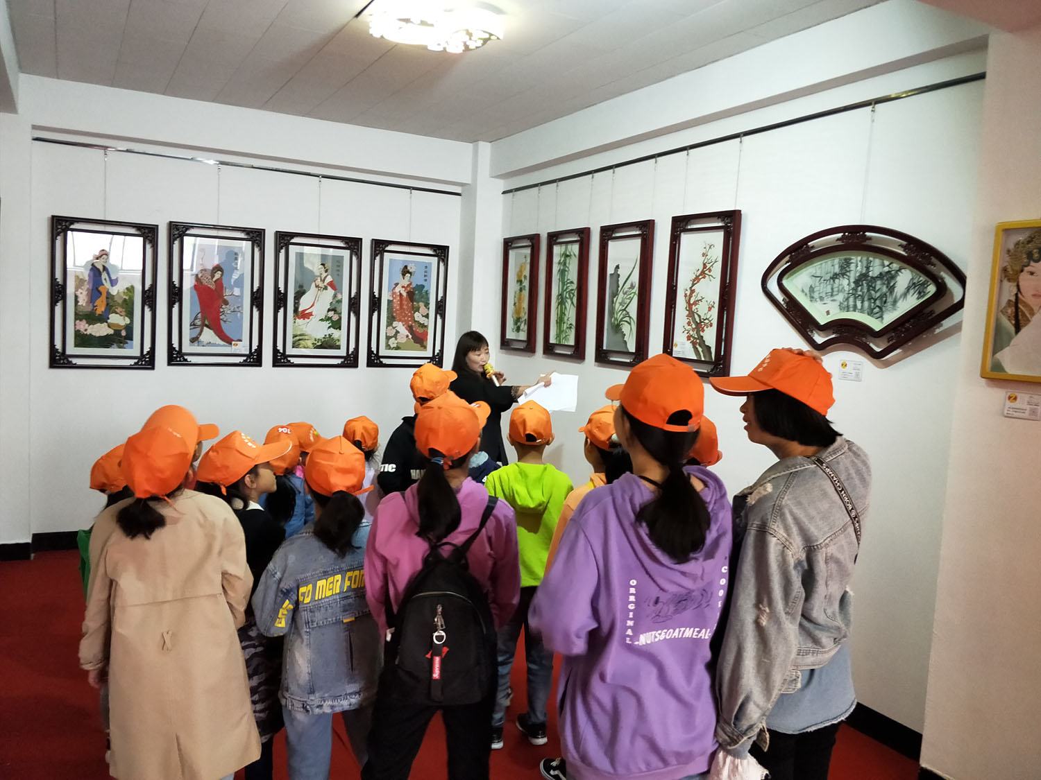 鄭氏砂藝講解員在為研學小朋友們講解砂畫作品《梅》、《蘭》、《竹》、《菊》的創作意義