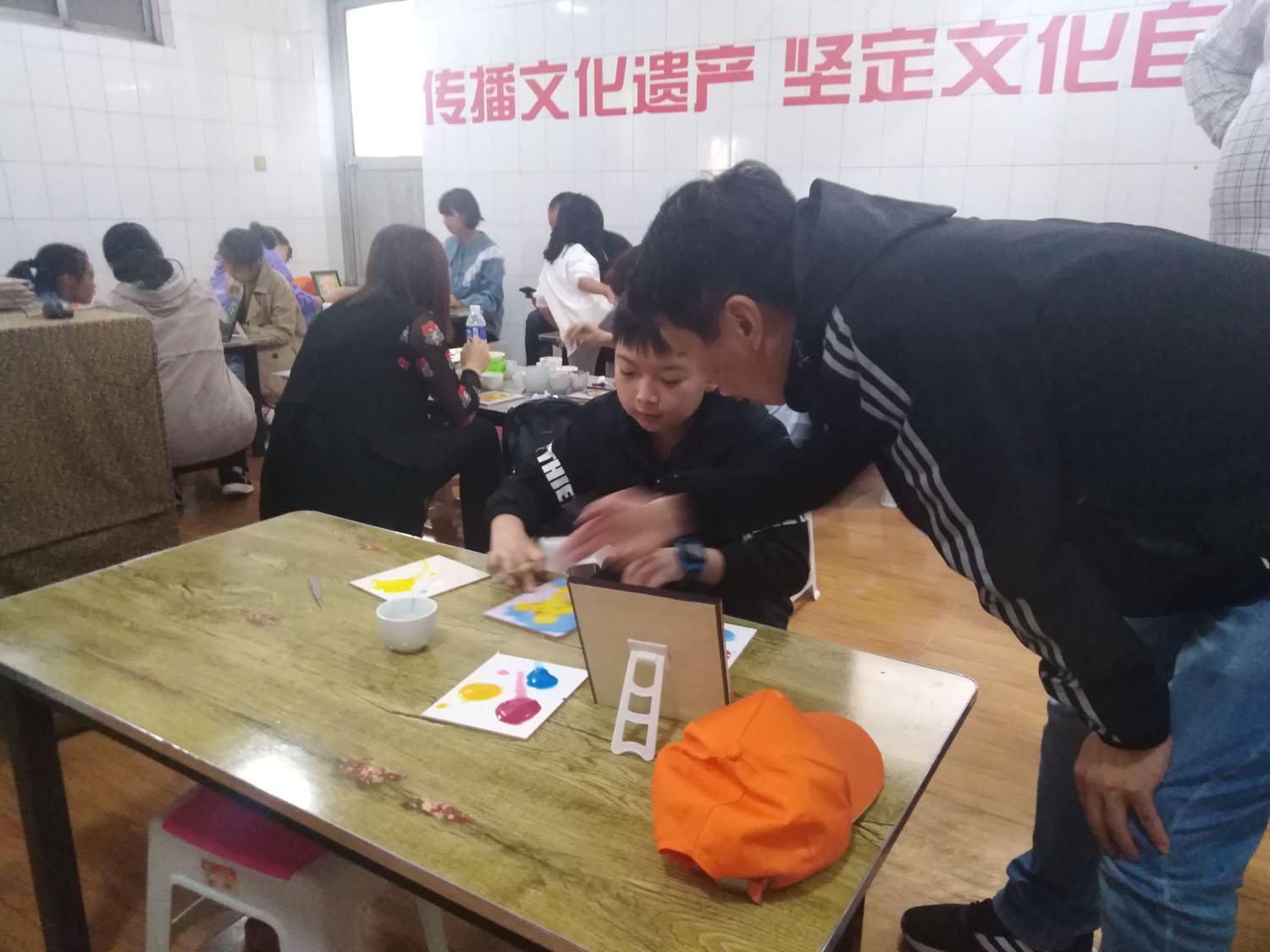 研學小朋友和家長正在對砂畫點籃的顏色搭配進行探討