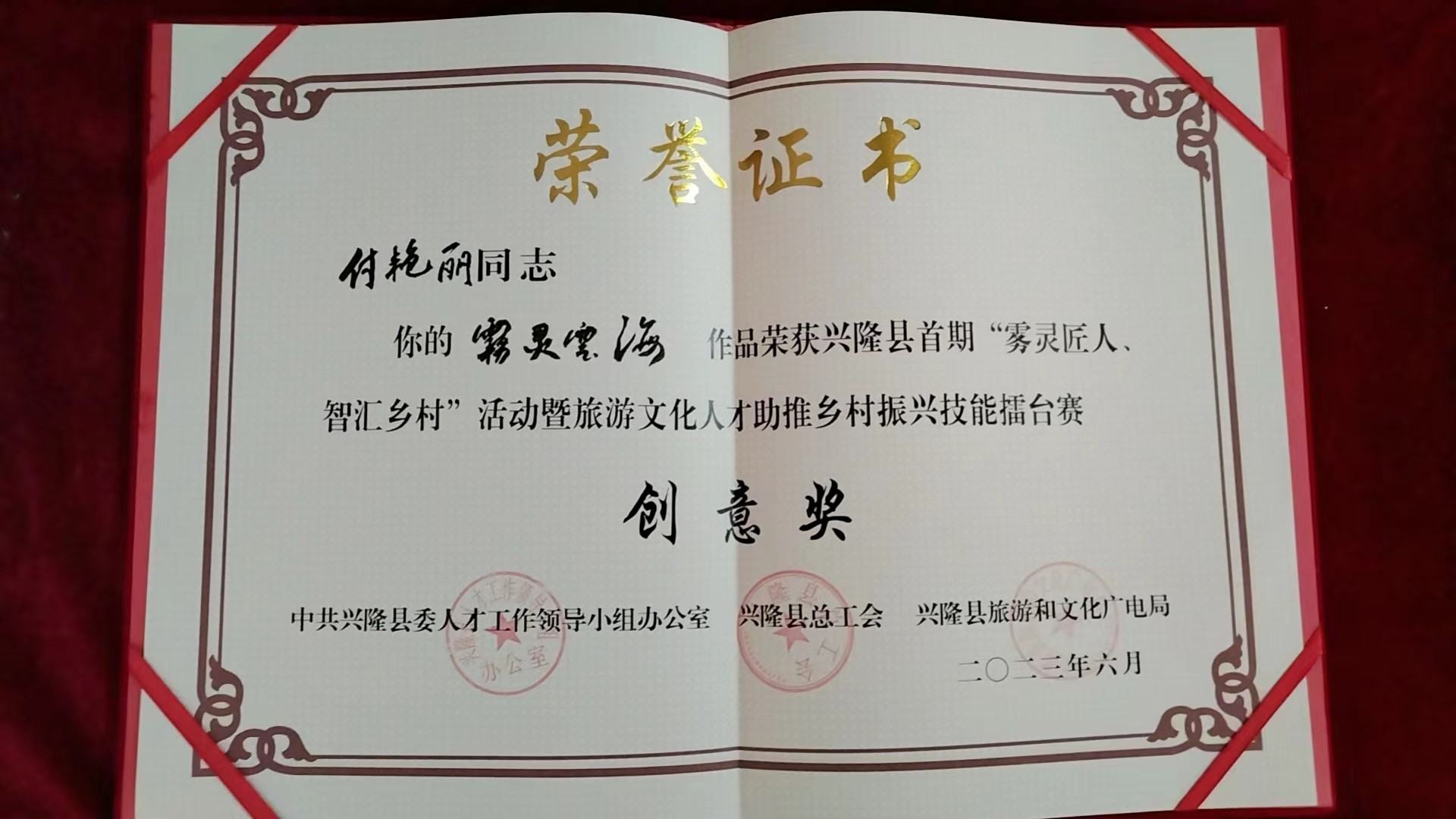 據了解,此次活動由興隆縣委人才辦、縣總工會、縣旅游和文化廣電聯合舉辦,興隆縣文化館協助組織,來自京津冀專業名家認真評審。全縣入圍的60余件書法美術、攝影、民間工藝美術、導游解說等四項共評比“霧靈匠人獎”5名,創意獎10名,優秀獎9名。歷時兩個月完美落幕。其中鄭氏砂藝砂畫技師付艷麗作品《霧靈云海》參加了此次評選,并榮獲民間工藝美術制作競賽類創意獎。