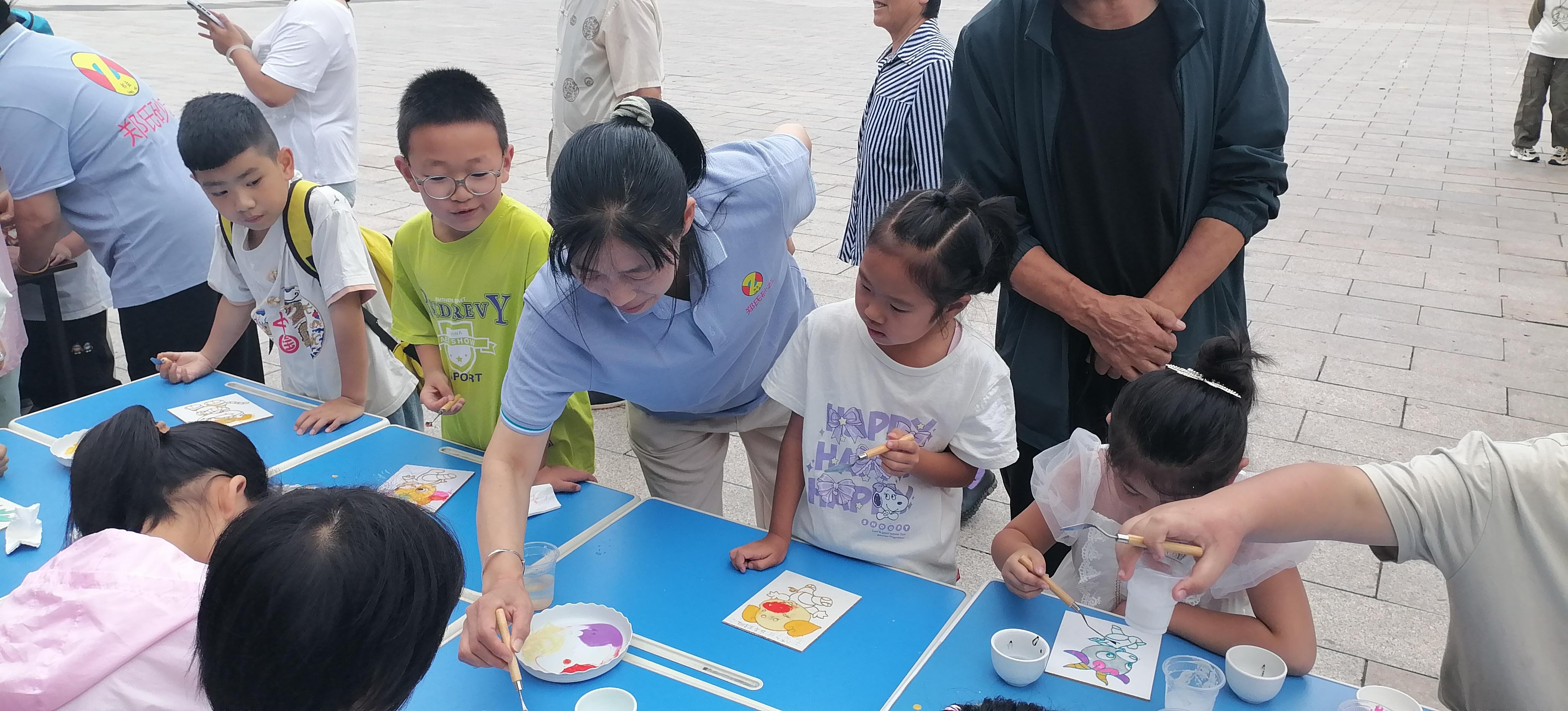活動現場,鄭氏砂藝的“天然彩砂+金銀絲”工藝成為孩子們的“興趣焦點”。作為興隆縣的省級非遺項目,鄭氏砂藝以天然礦物彩砂為原料,采用金絲銀線勾勒圖案輪廓,再填充彩砂的傳統手法,既保留了鄉土文化特色,又蘊含著非遺技藝的巧思。為讓孩子們輕松參與,技師們特意提前制作了粘好金絲的半成品——一幅幅待填充的砂畫作品,將“最精彩的創作環節”留給孩子。“我要給小虎的臉涂綠色!”“我喜歡藍色的眼睛!”孩子們圍坐桌前,手持作畫小鏟,認真地將色彩砂石填入金絲框架,同時互相交流“配色秘訣”,現場充滿了童真與熱鬧。